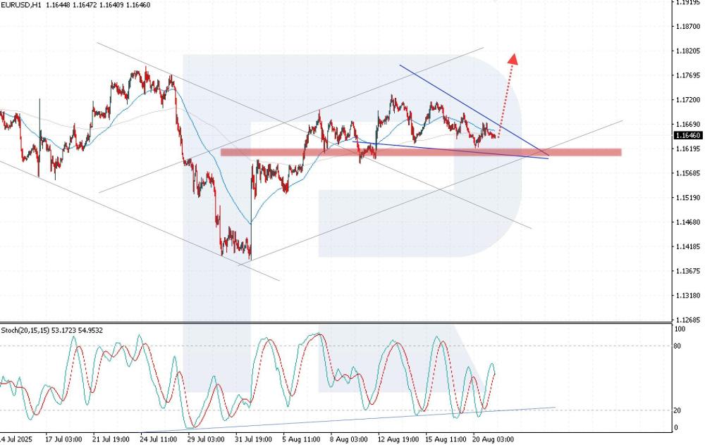 EURUSD holds steady ahead of Jerome Powell’s speech The EURUSD rate is correcting within a sideways range as investors focus on Fed signals. The current quote is 1.1646. Discover more in our analysis for 21 August 2025. EURUSD technical analysis The EURUSD rate is hovering within a Wedge pattern. An attempt to break below the 1.1620 support level has so far failed, keeping chances alive for an upward impulse. The EURUSD pair continues to consolidate, with further movement dependent on Fed signals and market sentiment regarding a rate cut. Read more - EURUSD Forecast Attention! Forecasts presented in this section only reflect the author’s private opinion and should not be considered as guidance for trading. RoboForex bears no responsibility for trading results based on trading recommendations described in these analytical reviews. Sincerely, The RoboForex Team -