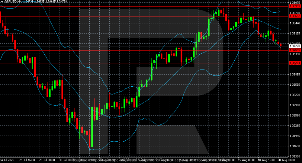 GBP awaits inflation, market assesses Bank of England policy outlook The GBPUSD pair dropped to 1.3472. UK inflation data will provide more clarity on the BoE’s policy outlook. Discover more in our analysis for 20 August 2025. GBPUSD technical analysis The GBPUSD pair is correcting after recent growth, trading near 1.3472. Earlier, the pair failed to hold above 1.3565 and rolled back, coming under selling pressure. The nearest support level is at 1.3420, and a breakout could open the way towards 1.3340. The GBPUSD pair is edging lower after recent gains. Read more - GBPUSD Forecast Attention! Forecasts presented in this section only reflect the author’s private opinion and should not be considered as guidance for trading. RoboForex bears no responsibility for trading results based on trading recommendations described in these analytical reviews. Sincerely, The RoboForex Team -