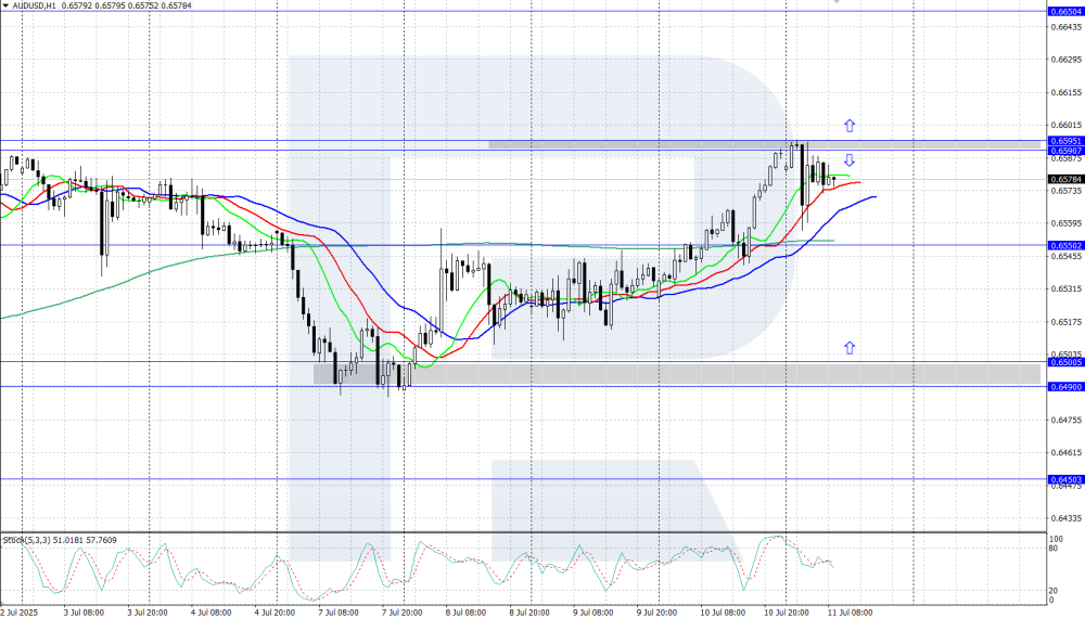 AUDUSD: the pair has updated its yearly high AUDUSD is rising, setting a new yearly high today at 1.6595. Details – in our analysis for 11 July 2025. AUDUSD technical analysis AUDUSD is showing confident growth within its upward trend, currently trading near 0.6590. The Alligator indicator confirms the bullish price movement momentum. Key resistance is at the yearly high of 0.6595. AUDUSD set a new yearly high at 1.6595. Read more - AUDUSD Forecast Attention! Forecasts presented in this section only reflect the author’s private opinion and should not be considered as guidance for trading. RoboForex bears no responsibility for trading results based on trading recommendations described in these analytical reviews. Sincerely, The RoboForex Team -