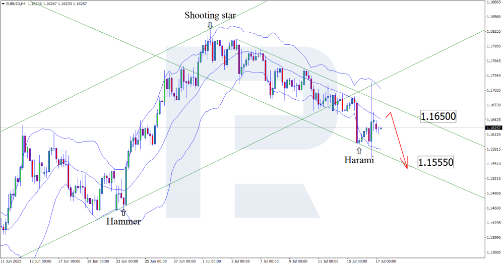 Fundamental storm, waiting for EURUSD reaction Amid strengthening USD, the EURUSD pair may decline towards 1.1555. Discover more in our analysis for 17 July 2025. EURUSD technical analysis On the H4 chart, the EURUSD pair formed a Harami reversal pattern near the lower Bollinger Band. At this stage, the pair may continue its corrective wave in response to this signal. Given that the price remains within a descending channel, a further decline towards the nearest support at 1.1555 can be expected. Today’s EURUSD forecast favours the USD. Combined with EURUSD technical analysis, stronger US economic indicators suggest a likely decline towards the 1.1555 support level after a corrective move. Read more - EURUSD Forecast Attention! Forecasts presented in this section only reflect the author’s private opinion and should not be considered as guidance for trading. RoboForex bears no responsibility for trading results based on trading recommendations described in these analytical reviews. Sincerely, The RoboForex Team -