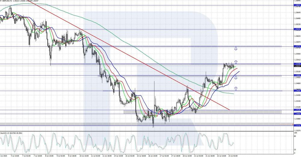 GBPUSD: the pair surged above 1.3500 The GBPUSD rate climbed above 1.3500, as markets anticipate the signing of a free trade agreement between the UK and India. Full details in our analysis for 23 July 2025. GBPUSD technical analysis On the H4 chart, GBPUSD shows a clear upward momentum, having bounced from daily support at 1.3370. The Alligator indicator is pointing upwards and rising steadily, suggesting the uptrend may continue. GBPUSD confidently rose above 1.3500. Read more - GBPUSD Forecast Attention! Forecasts presented in this section only reflect the author’s private opinion and should not be considered as guidance for trading. RoboForex bears no responsibility for trading results based on trading recommendations described in these analytical reviews. Sincerely, The RoboForex Team -