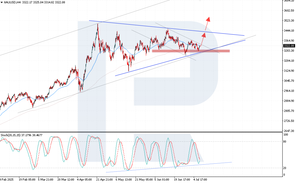 XAUUSD rises for the second day in a row – is a new upward wave starting? The XAUUSD price is forming a Triangle pattern, reflecting consolidation before a potential breakout. Current quote – 3,322 USD. Details – in our analysis for 10 July 2025. XAUUSD technical analysis XAUUSD quotes are strengthening after rebounding from the lower boundary of the Triangle pattern. Despite seller pressure in the first half of the week, the price is recovering, remaining above the key support level at 3,285. Weakness in the US dollar, expectations of rate cuts, and political pressure on the Fed create a favourable environment for further gold growth. Read more - Gold Forecast Attention! Forecasts presented in this section only reflect the author’s private opinion and should not be considered as guidance for trading. RoboForex bears no responsibility for trading results based on trading recommendations described in these analytical reviews. Sincerely, The RoboForex Team -