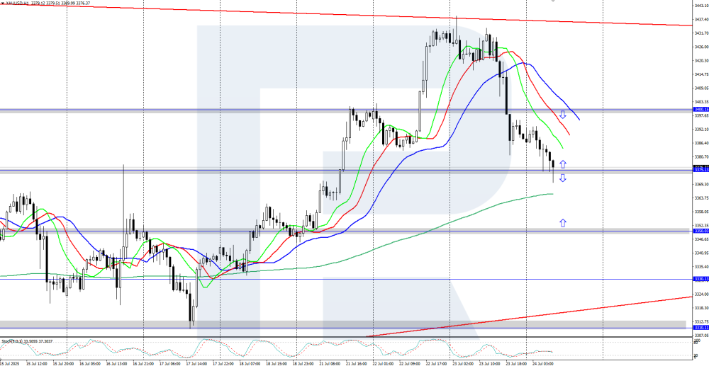 Gold (XAUUSD) falls below 3,400 USD amid correction XAUUSD prices reversed downwards and dropped below 3,400 USD amid optimism surrounding trade agreements between the US and its key partners. Discover more in our analysis for 24 July 2025. XAUUSD technical analysis XAUUSD quotes are in a downward correction, having fallen below 3,400 USD. Earlier this week, gold reversed from a local daily high at 3,438 USD. Once the correction is complete, the uptrend may resume. Gold entered a downward correction, slipping below 3,400 USD. Read more - Gold Forecast Attention! Forecasts presented in this section only reflect the author’s private opinion and should not be considered as guidance for trading. RoboForex bears no responsibility for trading results based on trading recommendations described in these analytical reviews. Sincerely, The RoboForex Team -