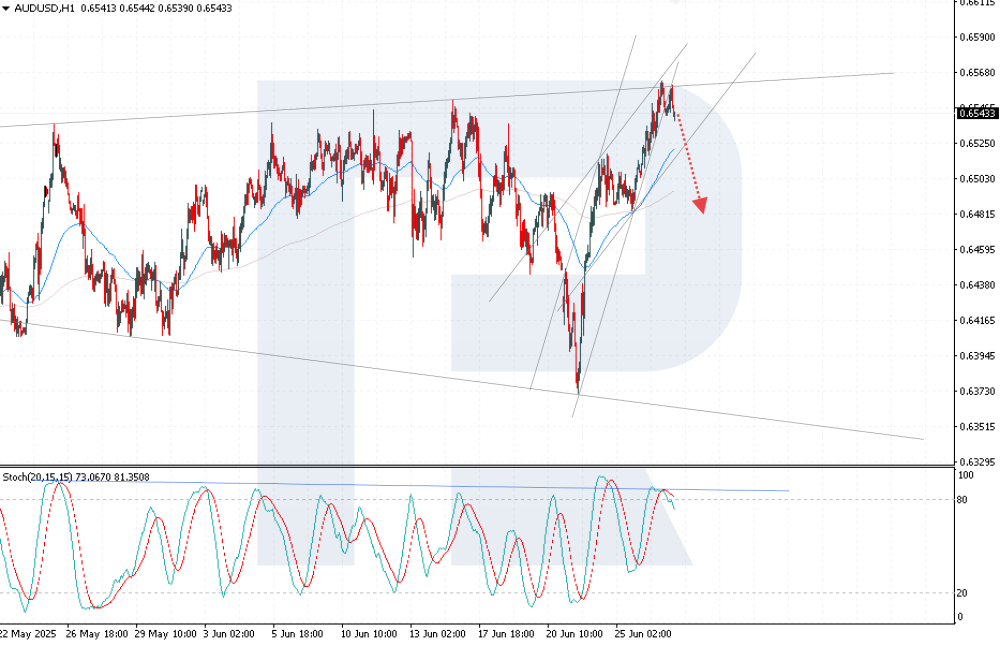 AUDUSD reversed downwards: 90% of traders expect an RBA rate cut The AUDUSD rate is declining after four consecutive days of growth amid expectations of an RBA rate cut. Current quote – 0.6540. Details – in our analysis for 27 June 2025. AUDUSD technical analysis The AUDUSD rate is correcting after rebounding from the upper boundary of the Broadening Triangle pattern. The current price chart structure indicates the completion of the upward impulse and the formation of a bearish correction. The AUDUSD rate came under pressure due to expectations of an RBA rate cut and US dollar strengthening amid easing geopolitical risks. Read more -AUDUSD Forecast Attention! Forecasts presented in this section only reflect the author’s private opinion and should not be considered as guidance for trading. RoboForex bears no responsibility for trading results based on trading recommendations described in these analytical reviews. Sincerely, The RoboForex Team -