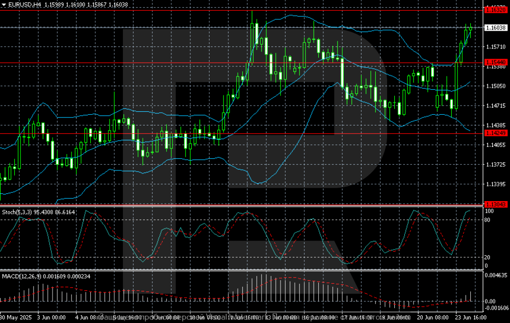 EURUSD surges above 1.1600 amid weakening dollar The EURUSD rate is climbing rapidly, rising above 1.1600 amid a weakening US dollar and upbeat economic data from the eurozone. Find more details in our analysis for 25 June 2025. EURUSD forecast: key trading points Market focus: Germany's ifo Business Climate Index rose to 88.4 in June 2025 Current trend: upward trend persists EURUSD forecast for 25 June 2025: 1.1577 and 1.1642 Fundamental analysis The US dollar continues to weaken following the announcement of a ceasefire between Iran and Israel. Continued oil supply from the Middle East has eased investor concerns over inflation and supports expectations for further Federal Reserve rate cuts this year. Germany’s ifo Business Climate Index climbed to 88.4 in June 2025, its highest level in nearly a year, up from 87.5 in May and slightly above forecasts of 88.2. The expectations component jumped to 90.7, the highest since April 2023. RoboForex Market Analysis & Forex Forecasts Attention! Forecasts presented in this section only reflect the author’s private opinion and should not be considered as guidance for trading. RoboForex bears no responsibility for trading results based on trading recommendations described in these analytical reviews. Sincerely, The RoboForex Team- 348 replies