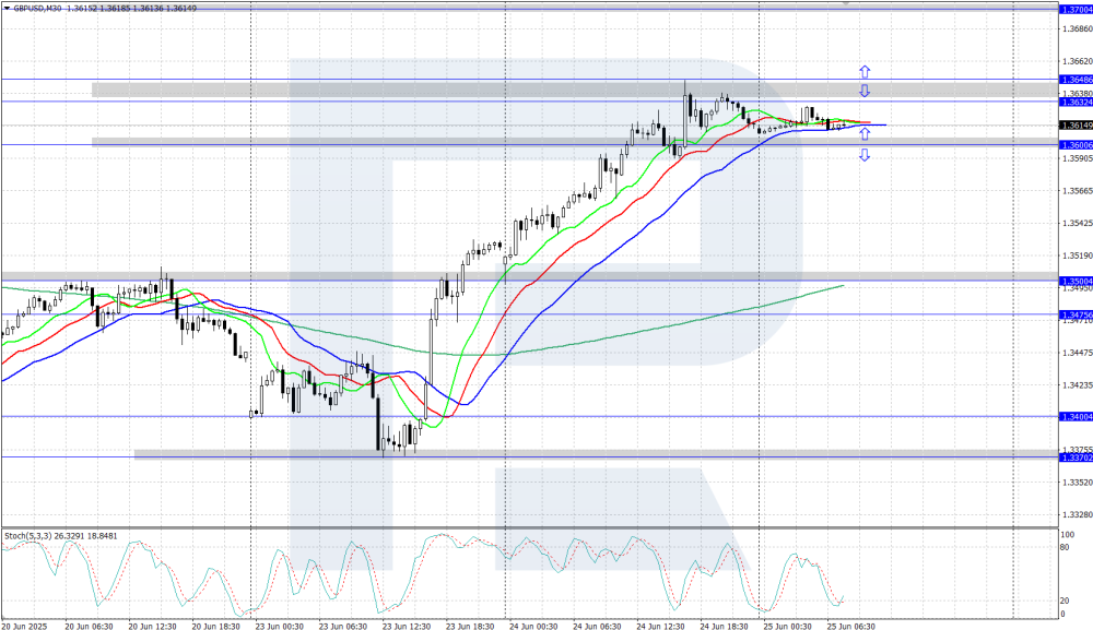 GBPUSD surges higher The GBPUSD rate jumped above 1.3600 as the US dollar weakened amid the ceasefire in the Middle East. Discover more in our analysis for 25 June 2025. GBPUSD technical analysis On the H4 chart, the GBPUSD pair maintains its strong upward trajectory, climbing into a three-year high region. The Alligator indicator is pointing upwards, confirming bullish momentum. The key trend support lies at 1.3370. The GBPUSD pair rose above 1.3600 amid easing geopolitical tensions in the Middle East. Read more - GBPUSD Forecast Attention! Forecasts presented in this section only reflect the author’s private opinion and should not be considered as guidance for trading. RoboForex bears no responsibility for trading results based on trading recommendations described in these analytical reviews. Sincerely, The RoboForex Team -