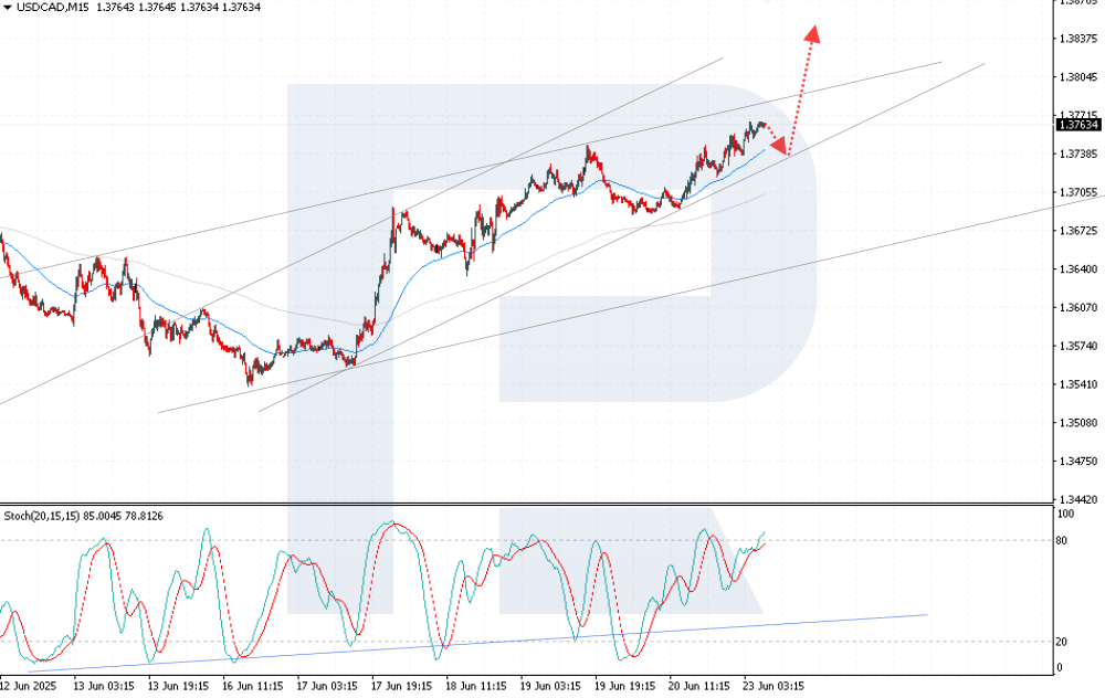 Middle East conflict and Canada’s economic weakness push USDCAD higher The USDCAD pair is strengthening amid signs of a weakening Canadian economy, with the price currently at 1.3757. Discover more in our analysis for 23 June 2025. USDCAD technical analysis The USDCAD rate continues to strengthen, with buyers retaining control over the market as prices remain within an ascending channel. Today’s USDCAD forecast anticipates a rebound from the EMA-65 and a climb towards 1.3845. Weak Canadian economic data and US dollar support driven by geopolitical instability continue to lift USDCAD. Read more - USDCAD Forecast Attention! Forecasts presented in this section only reflect the author’s private opinion and should not be considered as guidance for trading. RoboForex bears no responsibility for trading results based on trading recommendations described in these analytical reviews. Sincerely, The RoboForex Team -