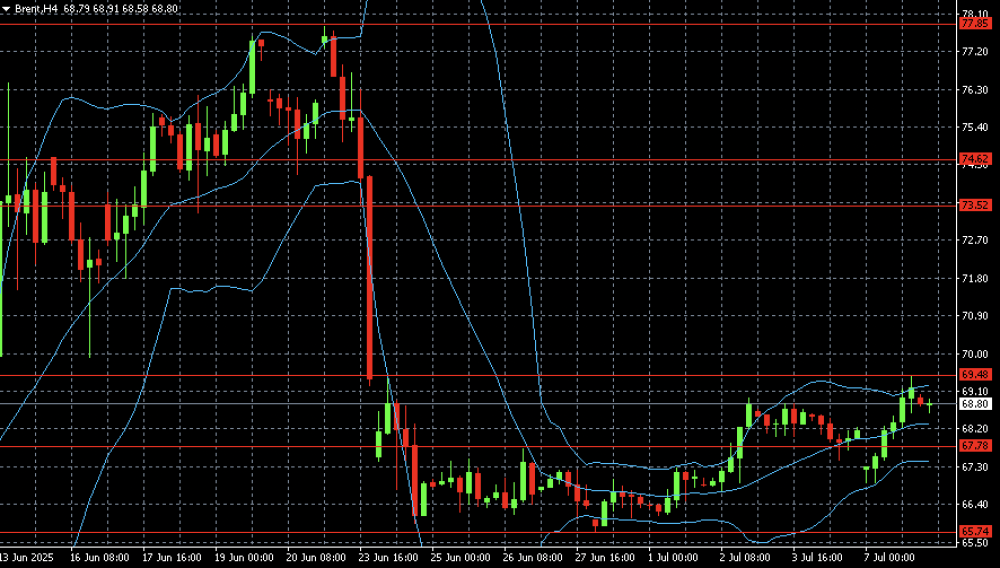 Brent near two-week high: OPEC+ decisions eased Red Sea events Brent price on Tuesday remains around 68.80 USD per barrel. News from Yemen balanced out market pressure. Details – in our analysis for 8 July 2025. Brent technical analysis On the H4 chart for Brent, a recovery is visible after the sharp fall between 21–24 June. After the collapse, quotes stabilised within a sideways range with a lower boundary near 65.74 and an upper at 67.78. Brent crude oil keeps its eye on the two-week high and remains close by. Read more - Brent Forecast Attention! Forecasts presented in this section only reflect the author’s private opinion and should not be considered as guidance for trading. RoboForex bears no responsibility for trading results based on trading recommendations described in these analytical reviews. Sincerely, The RoboForex Team -