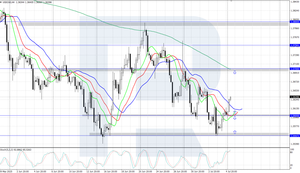 USDCAD: the pair reversed upwards, will growth continue? USDCAD reversed upwards and consolidated above 1.3600 amid weak Canadian economic data published last week. Details – in our analysis for 7 July 2025. USDCAD technical analysis On the H4 chart, USDCAD quotes show an upward correction within a downtrend. Quotes rebounded from daily support at 1.3557 and formed a reversal upwards. In the near term, there is a high probability of the upward correction continuing. USDCAD quotes reversed upwards and rose to an area above 1.3600. Read more - USDCAD Forecast Attention! Forecasts presented in this section only reflect the author’s private opinion and should not be considered as guidance for trading. RoboForex bears no responsibility for trading results based on trading recommendations described in these analytical reviews. Sincerely, The RoboForex Team -