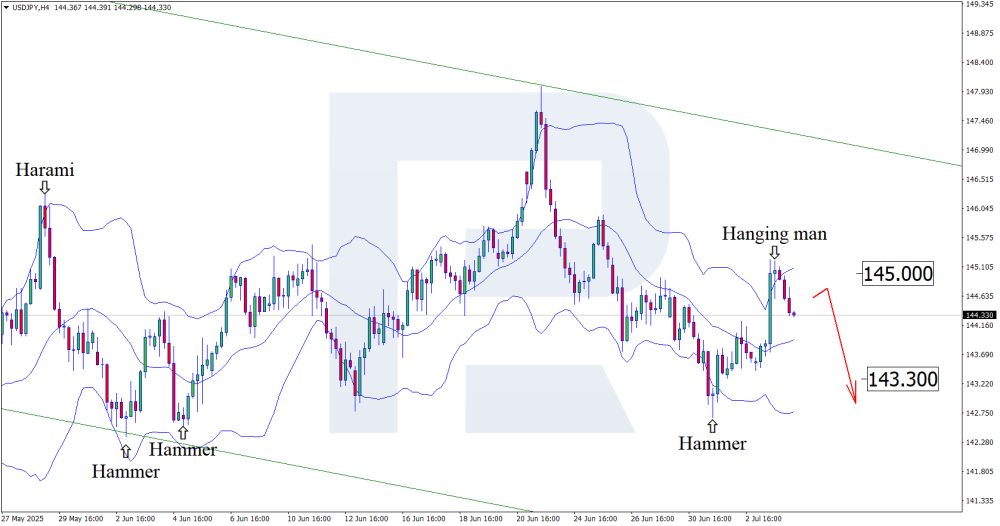 Record Japanese spending pressures the dollar: USDJPY prepares to fall Amid Japan’s economic data, the USDJPY rate may form a downward wave towards 143.30. Details – in our analysis for 4 July 2025. USDJPY technical analysis On the H4 chart, USDJPY, after testing the upper Bollinger Band, formed a Hanging Man reversal pattern and is now near 144.30. At this stage, it continues its downward wave in line with the pattern signal. USDJPY quotes remain within a descending channel, and based on this, it can be assumed that they have every chance of reaching support at 143.30. Against the backdrop of rising Japanese household spending, the USDJPY forecast looks optimistic for the yen. USDJPY technical analysis suggests a decline towards 143.30. Read more - USDJPY Forecast Attention! Forecasts presented in this section only reflect the author’s private opinion and should not be considered as guidance for trading. RoboForex bears no responsibility for trading results based on trading recommendations described in these analytical reviews. Sincerely, The RoboForex Team -